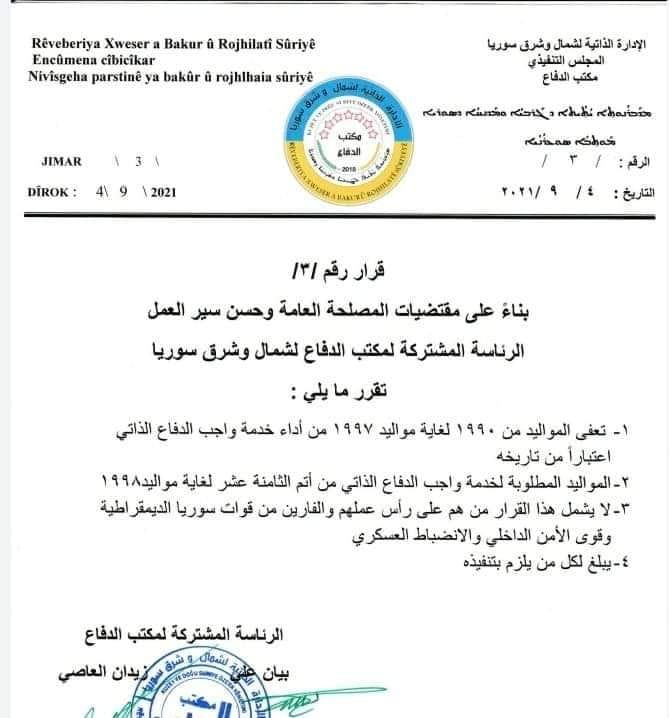 قرار من مكتب الدفاع في الإدراة الذاتية لشمال وشرق سوريا بإعفاء مواليد1990-1997 من خدمة واجب الدفاع الذاتي