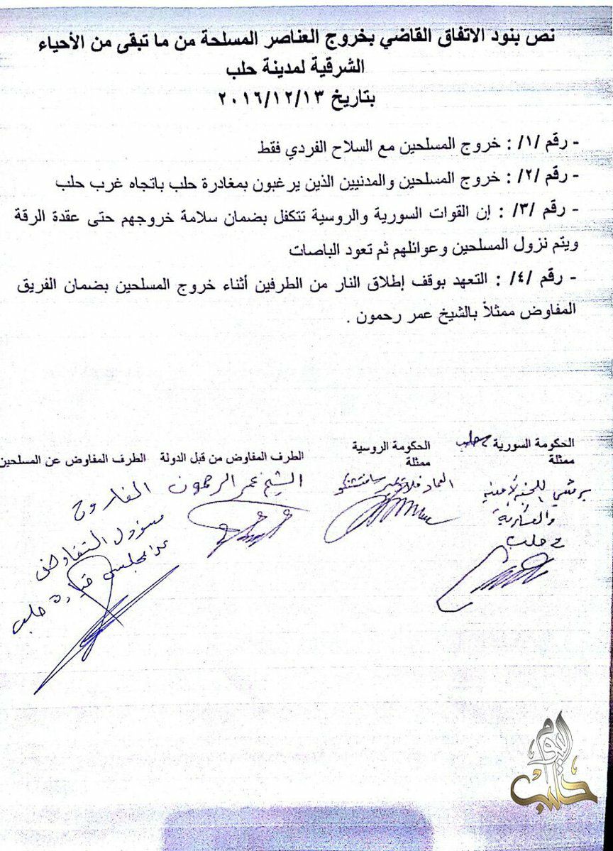 نص بنود الاتفاق القاضي بخروج العناصر المسلحة من ما تبقى من الأحياء الشرقية لمدينة حلب
