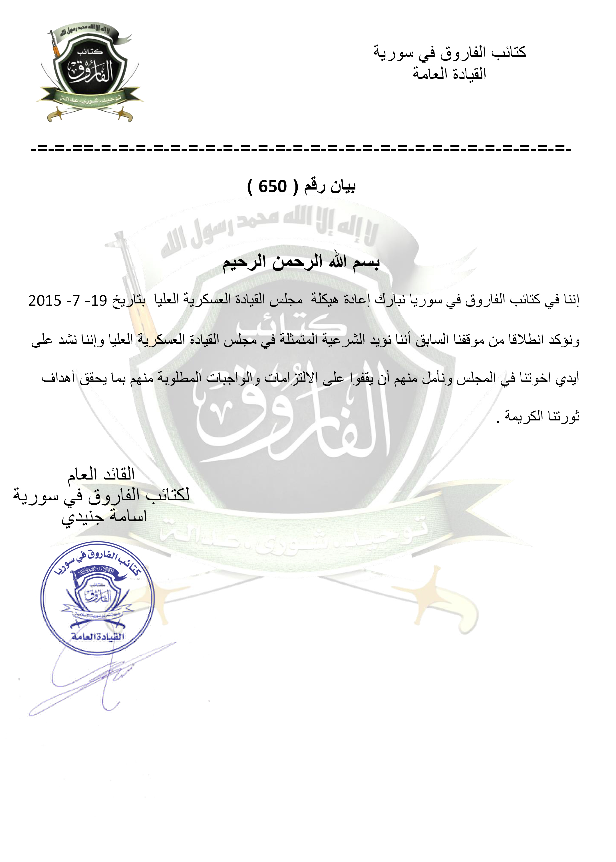 كتائب الفاروق تهنئ مجلس القيادة العسكرية العليا بإعادة هيكلته ١٩-٠٧-٢٠١٥