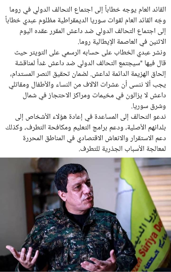 رسالة من مظلوم العبدي قائد قوات سوريا الديمقراطي إلى التحالف الدولي عبر تويتر خلال اجتماعهم في روما
