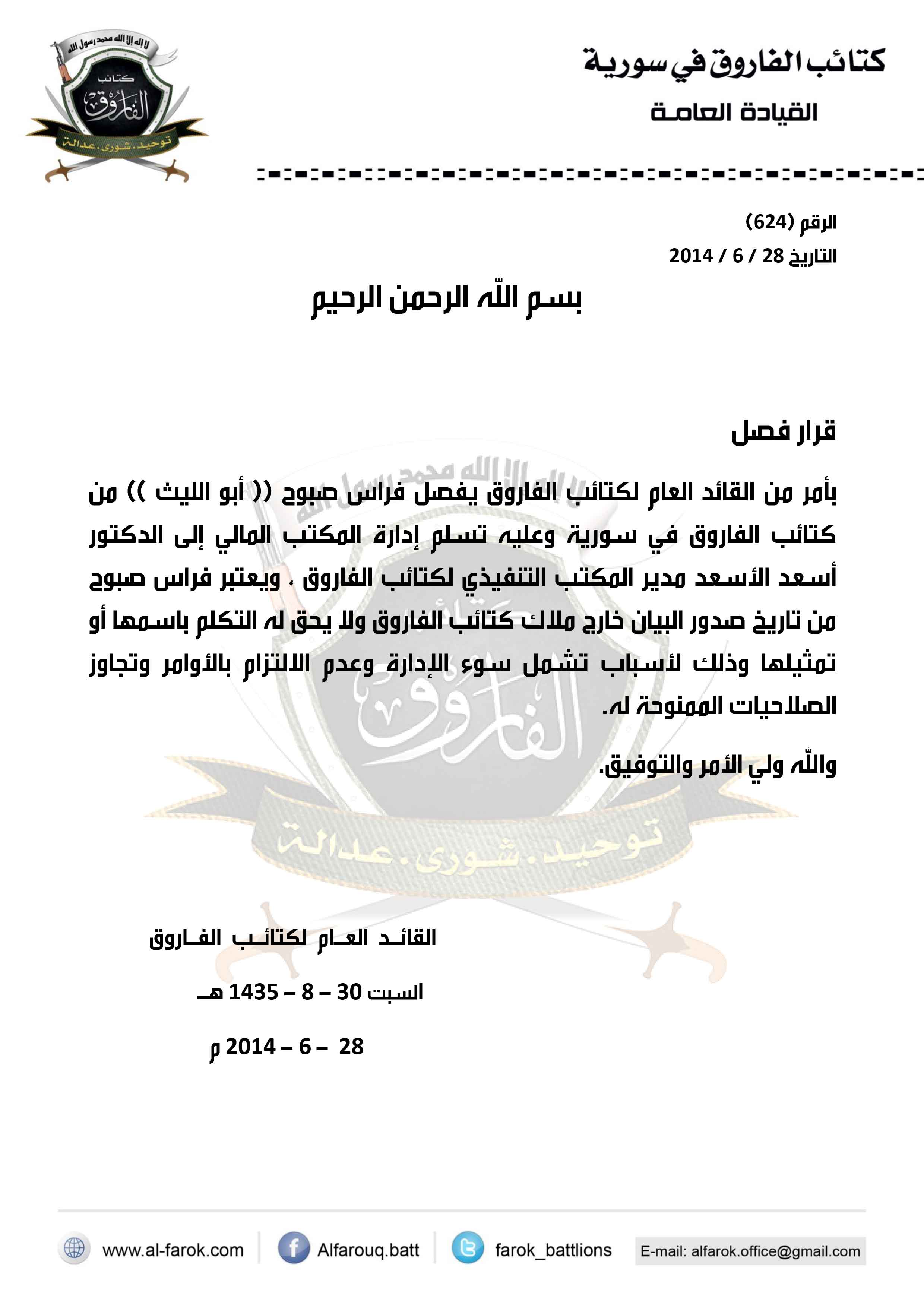 بأمر من القائد العام لكتائب الفاروق يفصل فراس صبوح (( أبو الليث )) من كتائب الفاروق في سورية وعليه تسلم إدارة المكتب المالي إلى الدكتور أسعد الأسعد مدير المكتب التنفيذي لكتائب الفاروق ، ويعتبر فراس صبوح من تاريخ صدور البيان خارج ملاك كتائب الفاروق ولا يحق له التكلم باسمها أو تمثيلها وذلك لأسباب تشمل سوء الإدارة وعدم الالتزام بالأوامر وتجاوز الصلاحيات الممنوحة له.