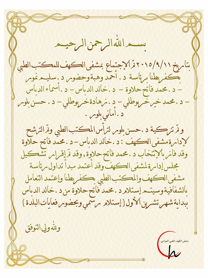 محضر اجتماع مشفى الكهف الطبي الجراحي الذي عقد بتاريخ 11-9-2015