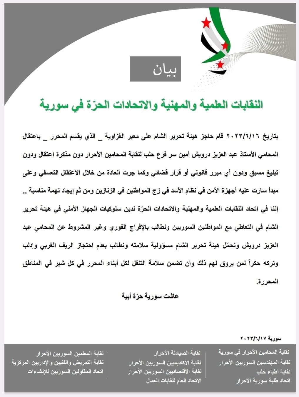 إننا في اتحاد النقابات المهنية والعلمية والاتحادات الحرة ندين سلوكيات الجهاز الامني في هيئة تحرير الشام في التعاطي مع المواطنين السوريين, ونطالب بالإفراج الفوري وغير المشروط عن المحامي الثائر عبد العزيز درويش, ونحمل هيئة تحرير الشام مسؤولية سلامته, ونطالب جميع القوى الفاعلة بضمان سلامة التنقل لكل أبناء المحرر في كل شبر في المناطق المحررة .