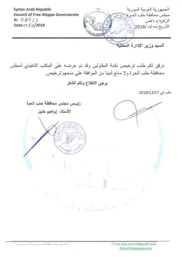 بيان من مجلس محافظة حلب الحرة يعلن فيه موافقته لترخيص نقابة المقاولين فرع حلب