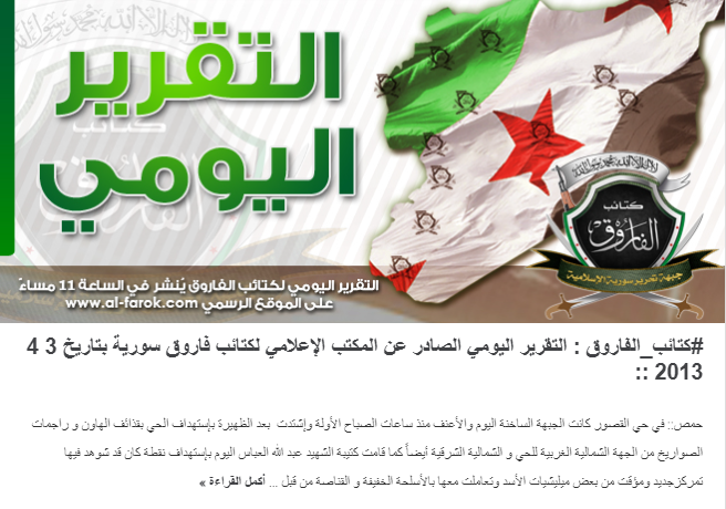 التقرير اليومي الصادر عن المكتب الإعلامي لكتائب فاروق سورية بتاريخ 3 4 2013