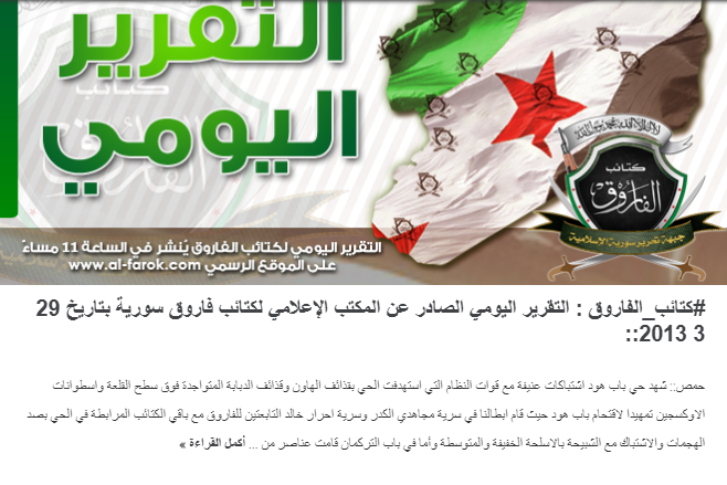 التقرير اليومي الصادر عن المكتب الإعلامي لكتائب فاروق سورية بتاريخ 29 3 2013