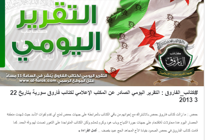 التقرير اليومي الصادر عن المكتب الإعلامي لكتائب فاروق سورية بتاريخ 22 3 2013