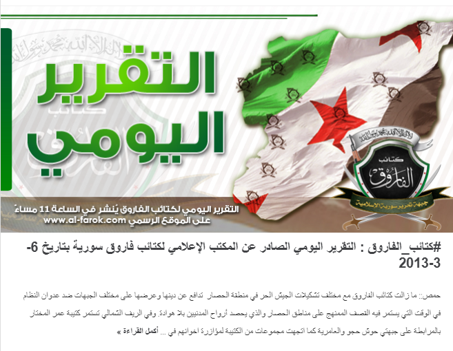 التقرير اليومي الصادر عن المكتب الإعلامي لكتائب فاروق سورية بتاريخ 6-3-2013