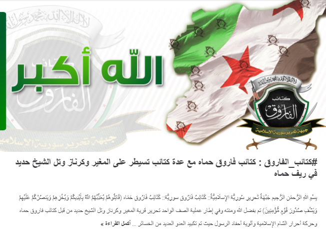 بِسْمِ اللهِ الرَّحمَنِ الرَّحِيم جَبْهَةُ تَحرِيرِ سُورِيَّة الإِسلَامِيَّةُ:: كَتَائِبُ فَارُوقِ سورِيَّة:: كَتَائِبُ فَارُوقِ حَمَاه (قَاتِلُوهُمْ يُعَذِّبْهُمُ اللّهُ بِأَيْدِيكُمْ وَيُخْزِهِمْ وَيَنصُرْكُمْ عَلَيْهِمْ وَيَشْفِ صُدُورَ قَوْمٍ مُّؤْمِنِينَ) تم بفضل الله ومنته وفي إطار عملية الصف الواحد تحرير قرية المغير وكرناز وتل الشيخ حديد من قبل كتائب فاروق حماه وحركة أحرار الشام الإسلامية وألوية أحفاد الرسول حيث تم تكبيد العدو العديد من الخسائر ...