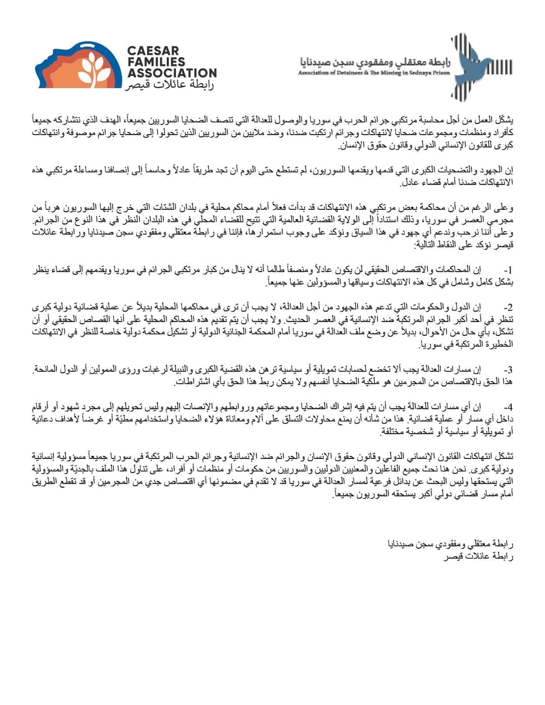بيان من رابطة عائلات قيصر ورابطة معتقلي ومفقودي سجن صيدنايا حول مسؤولية الجميع في العمل من أجل محاسبة مرتكبي جرائم الحرب