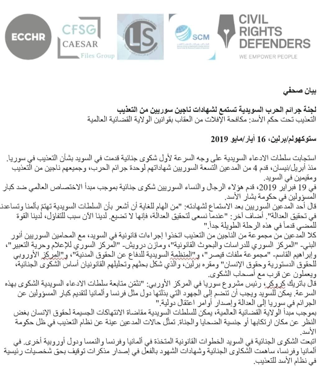 بيان صحفي للمحامي أنور البني حول الدعوى التي شارك بتقديمها في استوكهولم ضد ٢٥ شخصية في أجهزة الأمن من تسعة ناجين من الاعتقال والتعذيب في سجون النظام