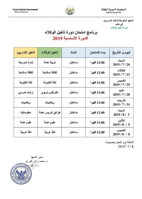 إعلان من معهد حلب لإعداد المدرسين حول برنامج امتحان دورة تأهيل الوكلاء لعام 2019