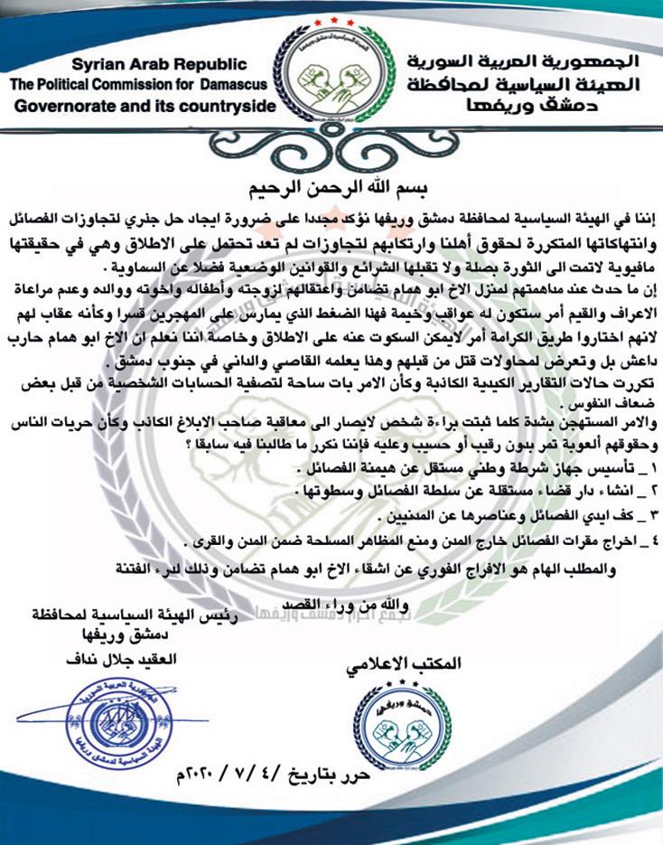 بيان الهيئة السياسية لمحافظة دمشق وريفها حول تجاوزات الفصائل في المحرر وقضية أبو همام تضامن