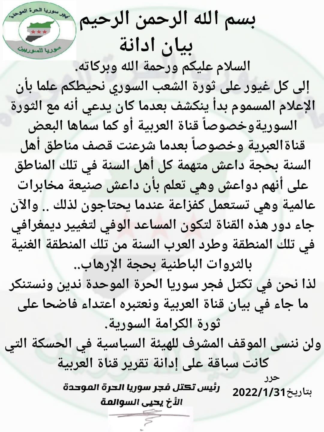 بيان إدانة من تكتل فجر سوريا الحرة لتصريحات قناة العربية