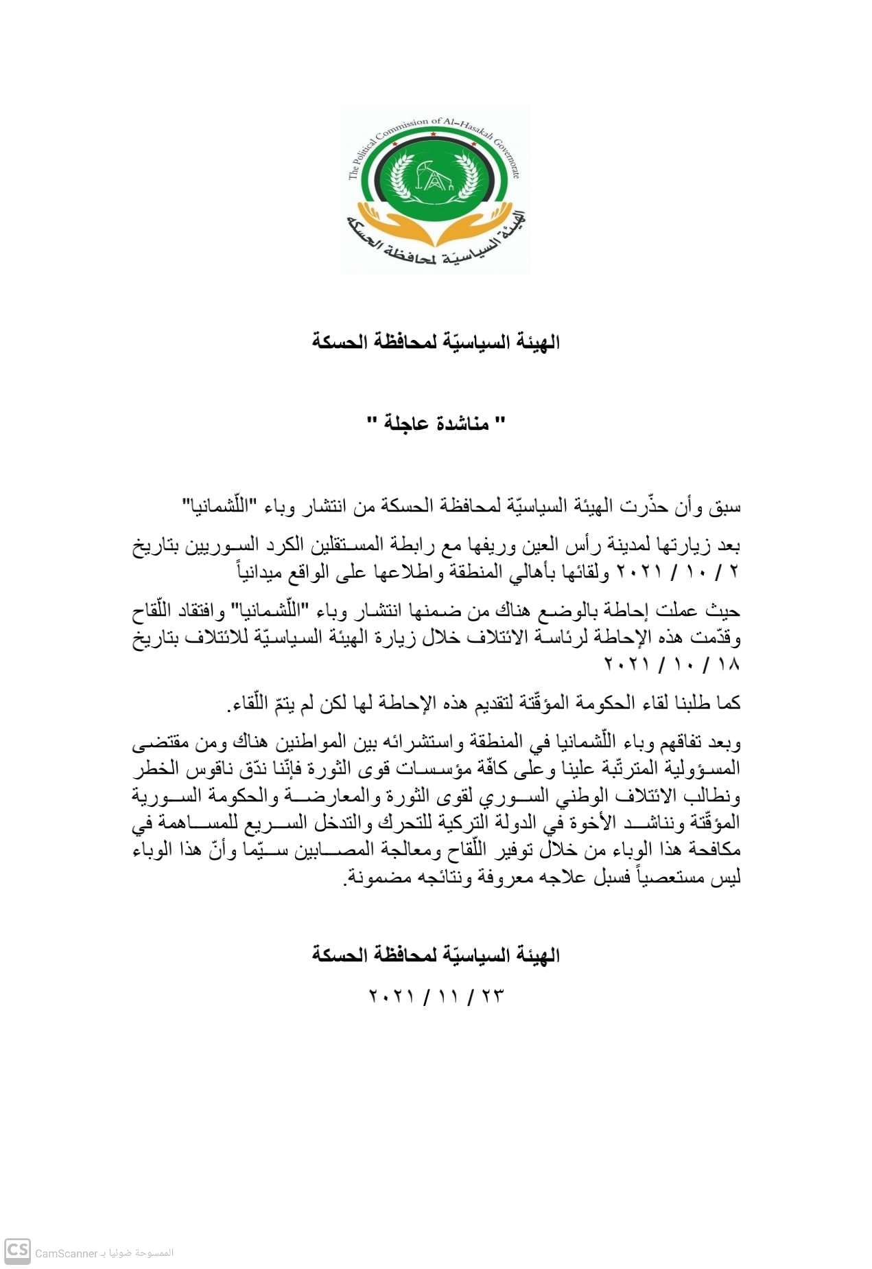 وبعد تفاقهم وباء اللّشمانيا في المنطقة واستشرائه بين المواطنين هناك ومن مقتضى المسؤولية المترتّبة علينا وعلى كافّة مؤسسات قوى الثورة فإنّنا ندّق ناقوس الخطر ونطالب الائتلاف الوطني السوري لقوى الثورة والمعارضة والحكومة السورية المؤقّتة ونناشد الأخوة في الدولة التركية للتحرك والتدخل السريع للمساهمة في مكافحة هذا الوباء من خلال توفير اللّقاح ومعالجة المصابين سيّما وأن هذا الوباء ليس مستعصياً فسبل علاجه معروفة ونتائجه مضمونة .