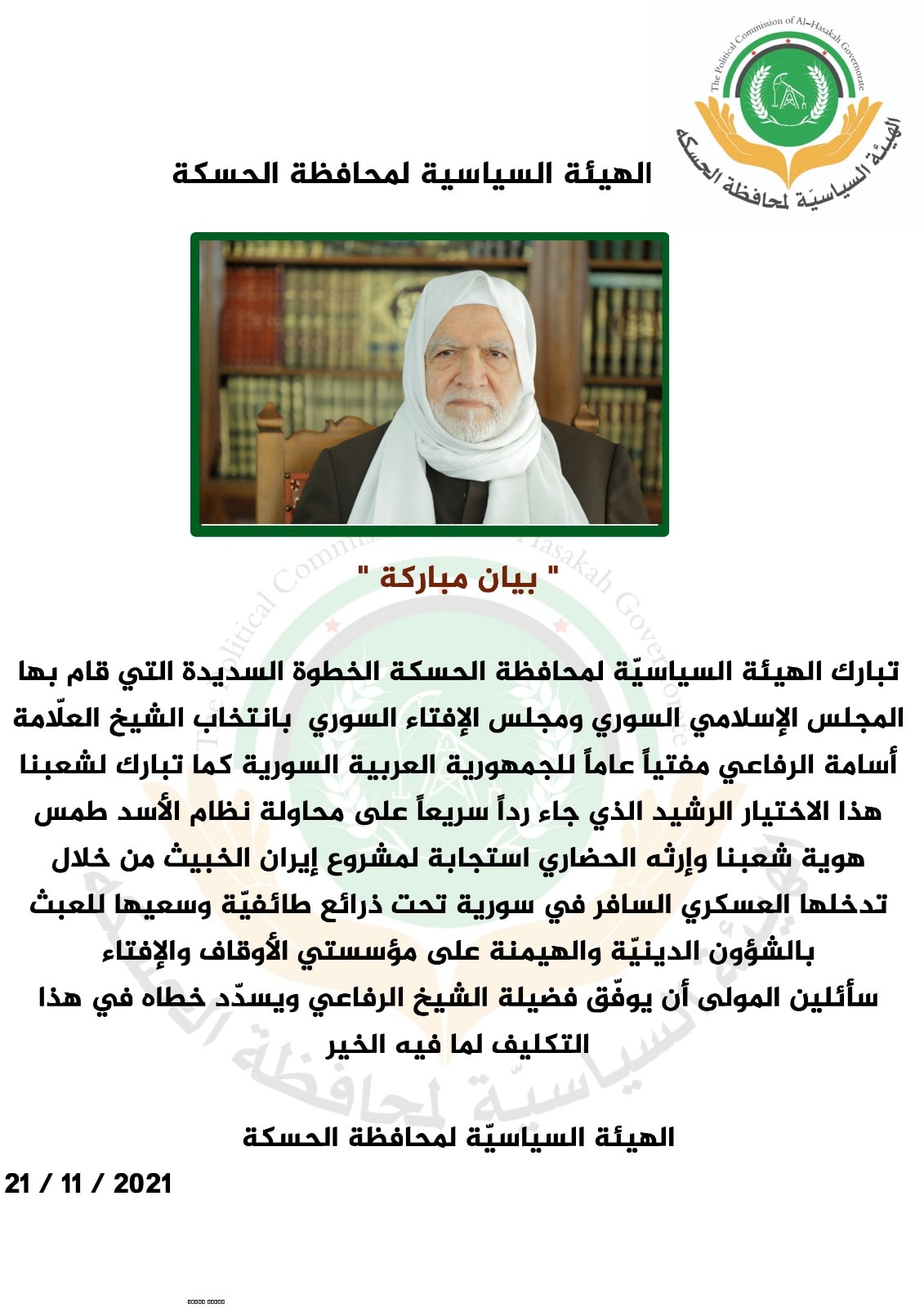 تبارك الهيئة السياسيّة لمحافظة الحسكة الخطوة السديدة التي قام بها المجلس الإسلامي السوري ومجلس الإفتاء السوري بانتخاب الشيخ العلّامة أسامة الرفاعي مفتياً عاماً للجمهورية العربية السورية كما تبارك لشعبنا هذا الاختيار الرشيد الذي جاء رداً سريعاً على محاولة نظام الأسد طمس هوية شعبنا وإرثه الحضاري استجابة لمشروع إيران الخبيث من خلال تدخلها العسكري السافر في سورية تحت ذرائع طائفيّة وسعيها للعبث بالشؤون الدينيّة والهيمنة على مؤسستي الأوقاف والإفتاء .