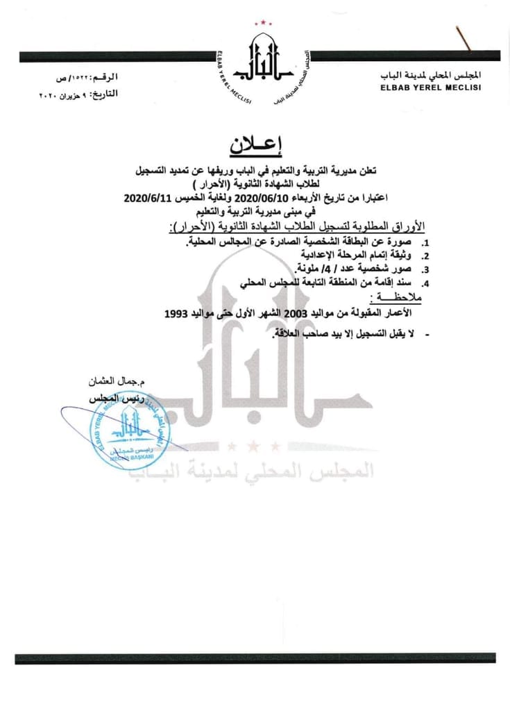 إعلان من المجلس المحلي في مدينة الباب حول إعلان مديرية التربية تمديد التسجيل لطلاب الشهادة الثانوية ( الأحرار ) حتى تاريخ الخميس 11\06\2020