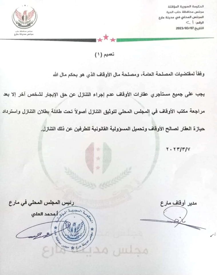 تعميم من المجلس المحلي في مارع إلى مستأجري محال الأوقاف عن التنازل عن المحال لشخص آخر إلا بعد مراجعة مكتب الأوقاف في المجلس