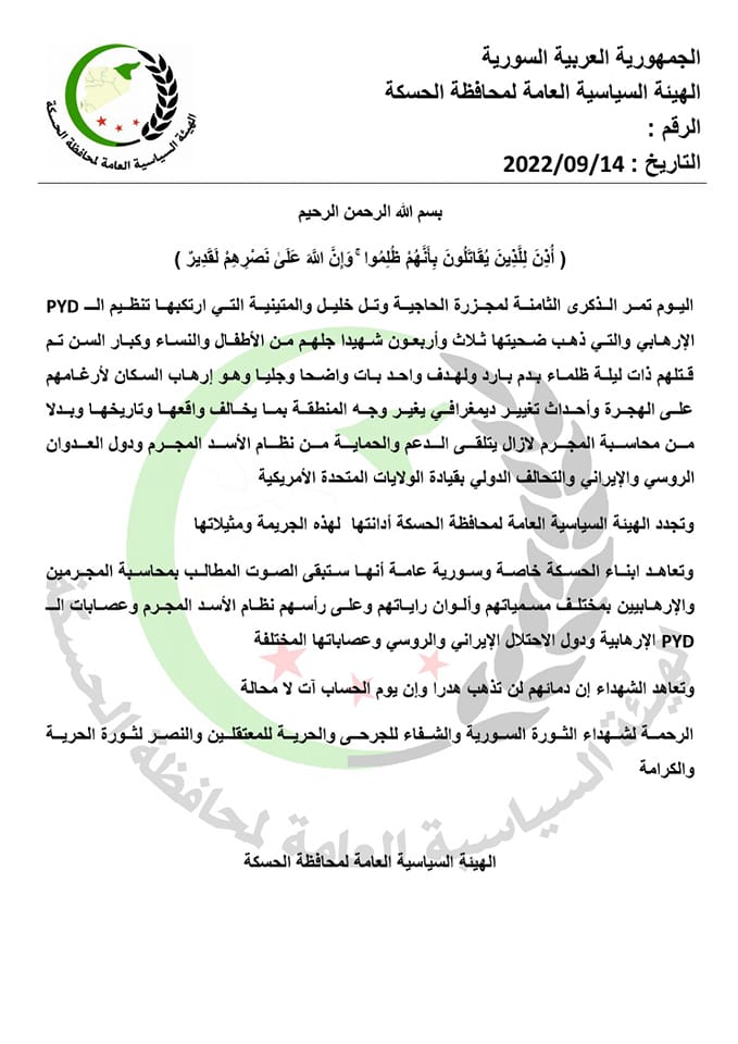 وتجدد الهيئة السياسية العامة لمحافظة الحسكة أدانتها لهذه الجريمة ومثيلاتها