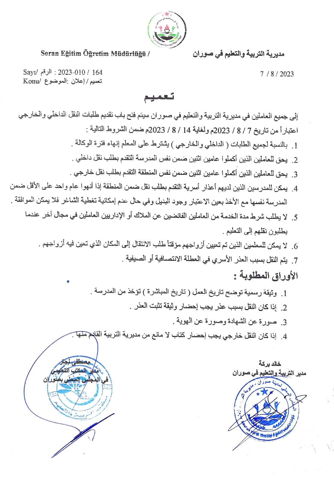 تعميم من مديرية التربية والتعليم في صوران تعلن فيه عن فتح باب تقديم طلبات النقل الداخلي والخارجي