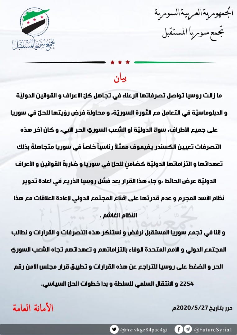 بيان رفض من تجمع سوريا المستقبل لقرار روسيا بتعيين مسؤول رئاسي روسي خاص بسوريا