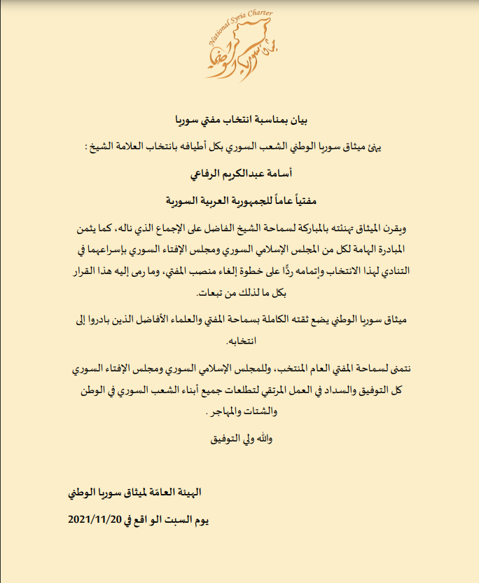 بيان ميثاق سوريا الوطني لتهنئة المجلس الإسلامي السوري وجميع السوريين بمناسبة انتخاب مفتي الجمهورية