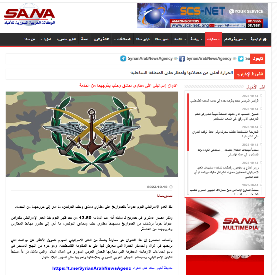 نفذ العدو الإسرائيلي اليوم عدواناً بالصواريخ على مطاري دمشق وحلب الدوليين، ما أدى إلى خروجهما من الخدمة. وذكر مصدر عسكري في تصريح لـ سانا: أنه عند الساعة 13.50 من بعد ظهر اليوم نفذ العدو الإسرائيلي بالتزامن عدواناً جوياً برشقات من الصواريخ مستهدفاً مطاري حلب ودمشق الدوليين، ما أدى إلى تضرر مهابط المطارين وخروجهما من الخدمة.