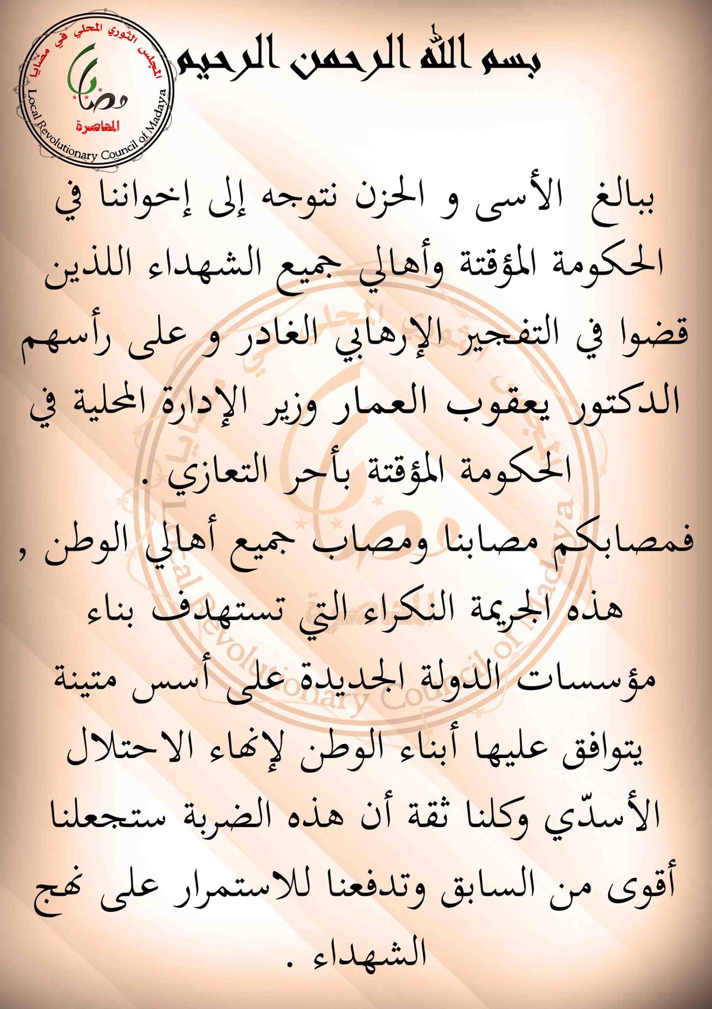 بيان من المجلس الثوري المحلي في مضايا يعزي فيه الحكومة المؤقتة بالوزير يعقوب العمار وعدد آخر من المواطنين