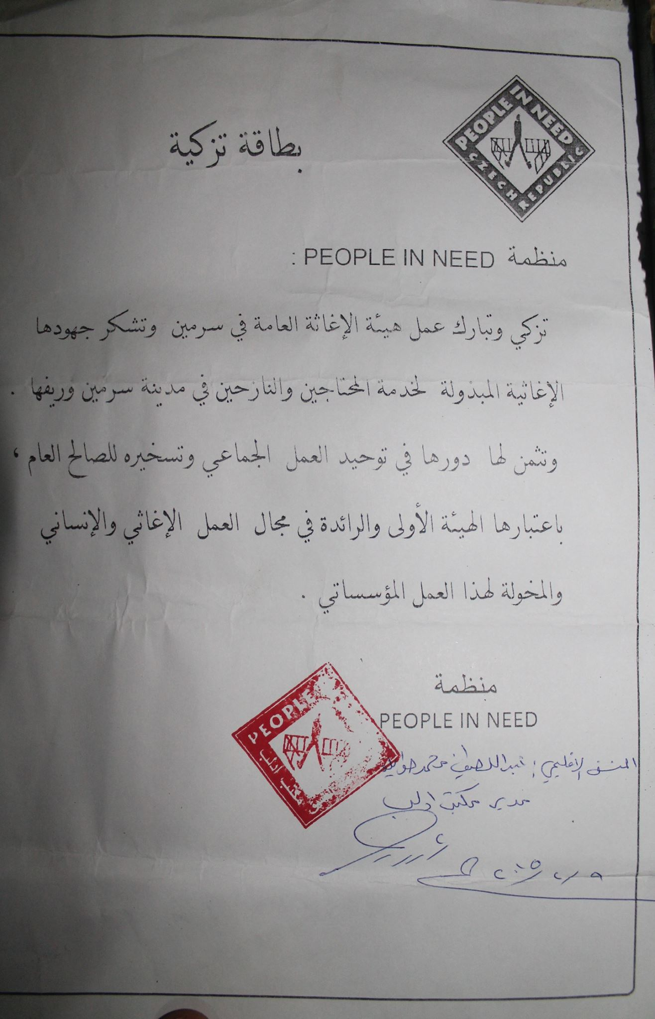 بطاقة تزكية من منظمة PEOPLE IN NEED حول ثقتها بعمل هيئة الإغاثة العامة في مدينة سرمين
