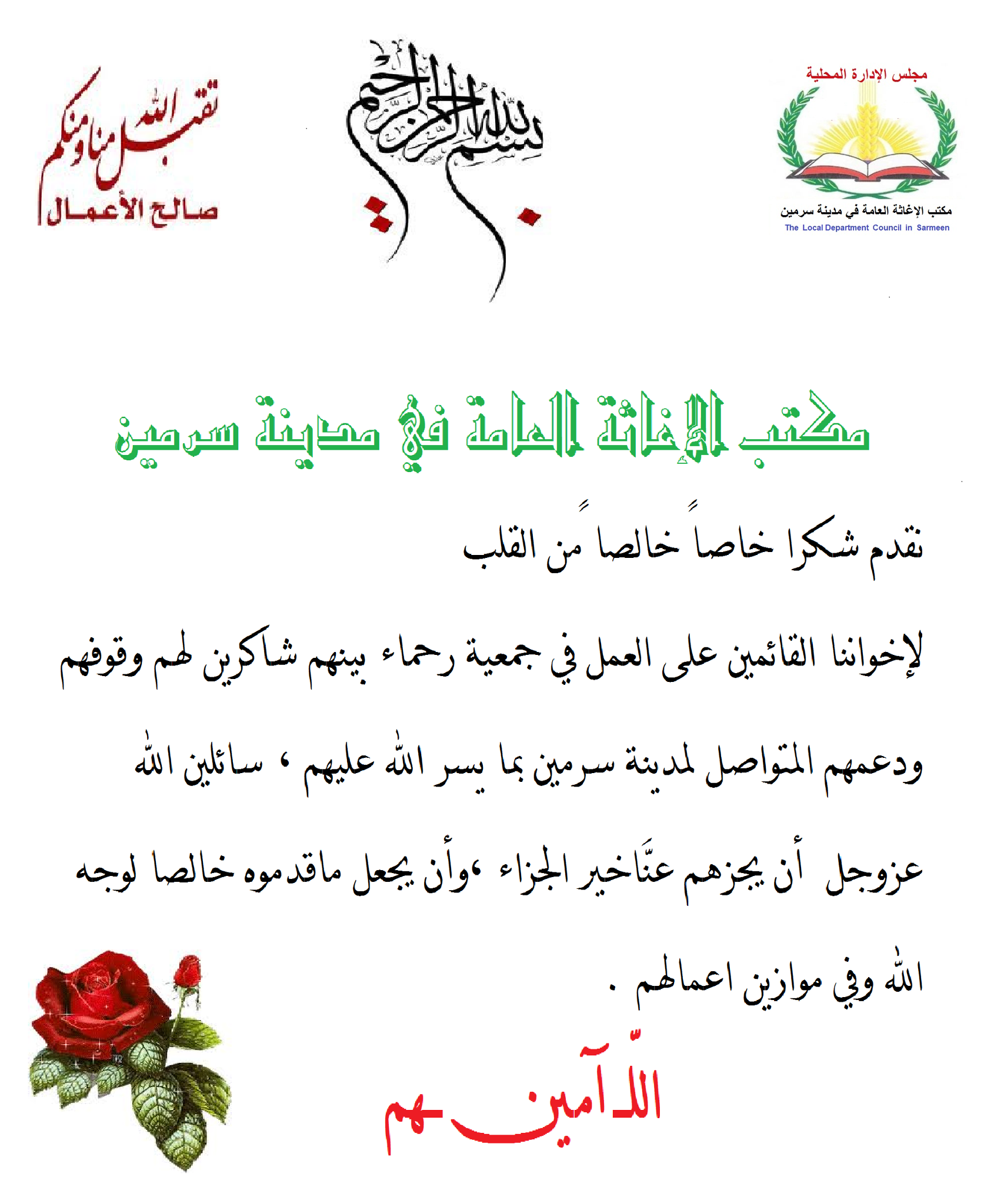 بطاقة شكر من هيئة الإغاثة العامة في سرمين لجمعية رحماء بينهم على دعمهم البلدة