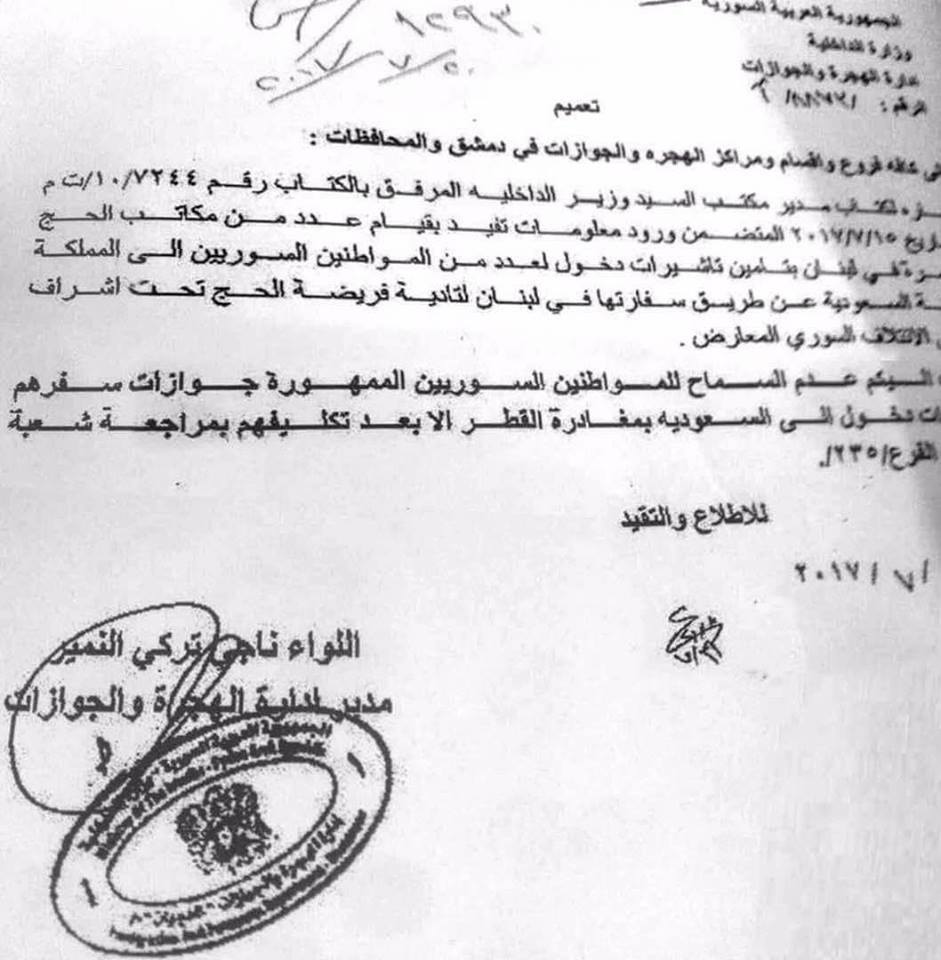 بالإشارة لكتاب مدير مكتب السيد وزير الداخلية المرفق بالكتاب رقم 7244/ 10/ت م بتاريخ 15/7/2017 المتضمن ورود معلومات تفيد بقيام عدد من مكاتب الحج والعمرة في لبنان بتامين تأشيرات دخول لعدد من المواطنين السوريين الى المملكة العربية السعودية عن طريق سفارتها في لبنان لتأدية فريضة الحج تحت إِشراف ما يسمى الائتلاف السوري المعارض.