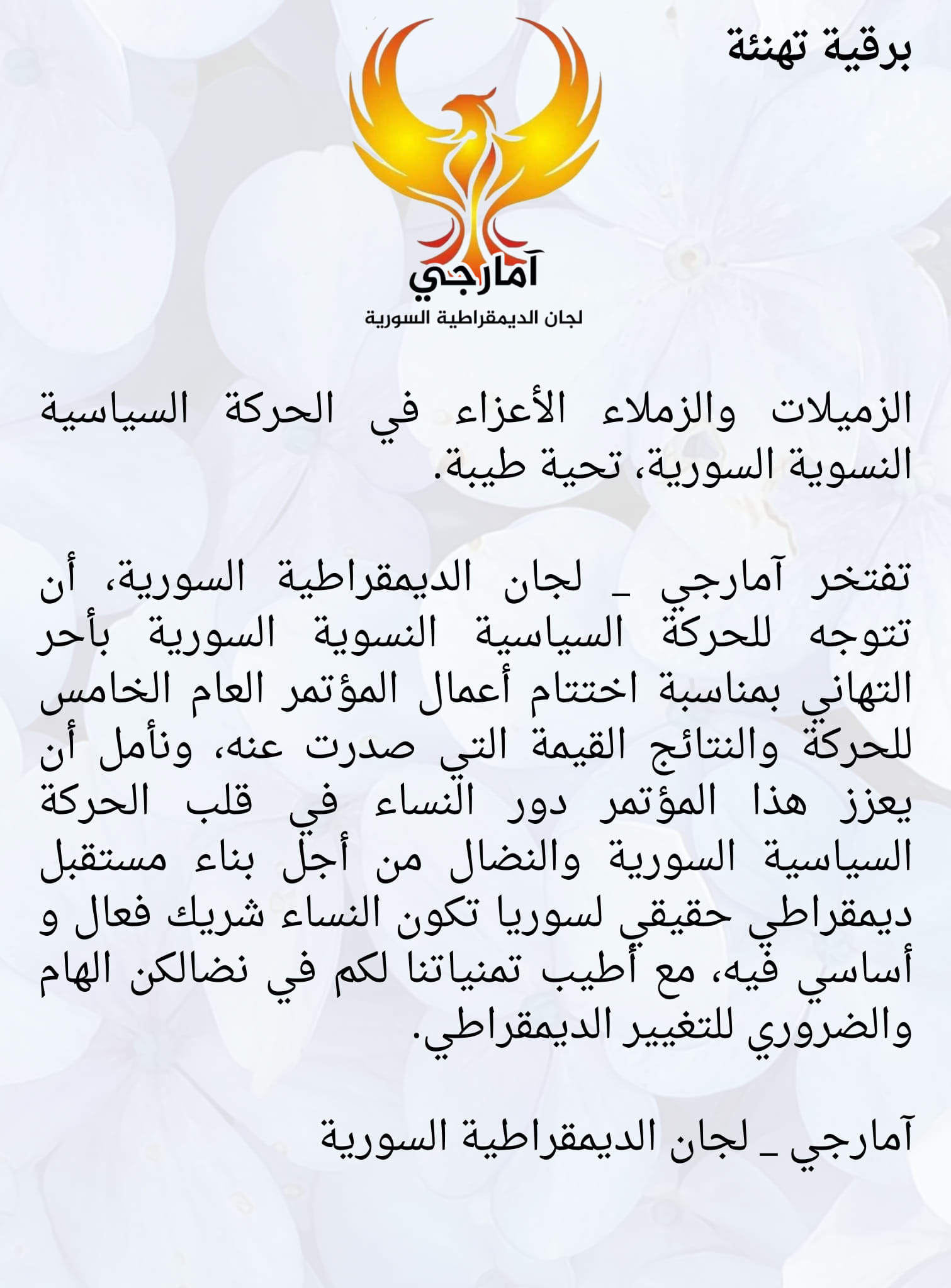برقية تهنئة من أمارجي للحركة السياسية النسوية السورية بمناسبة انعقاد مؤتمرها الخامس