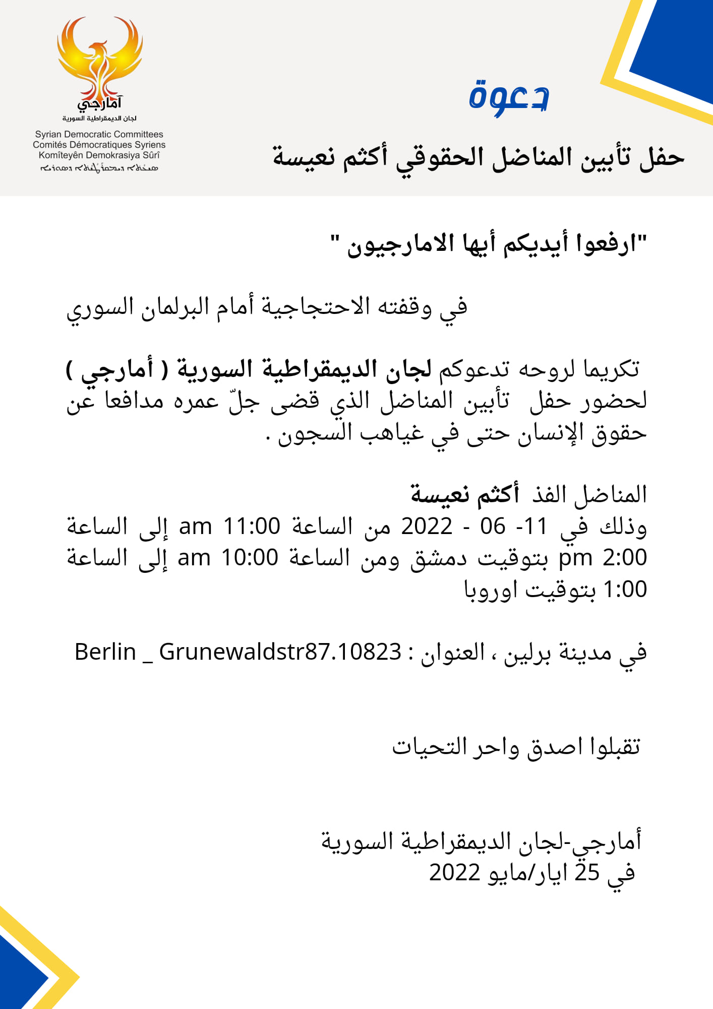 تتشرف آمارجي _ لجان الديمقراطية السورية بدعوتكم لحضور حفل تكريم لروح فقيد الحركةالديمقراطيه السورية المناضل المرحوم أكثم نعيسة الذي قضى جلّ عمره مدافعا عن حقوق الإنسان حتى في غياهب السجون.