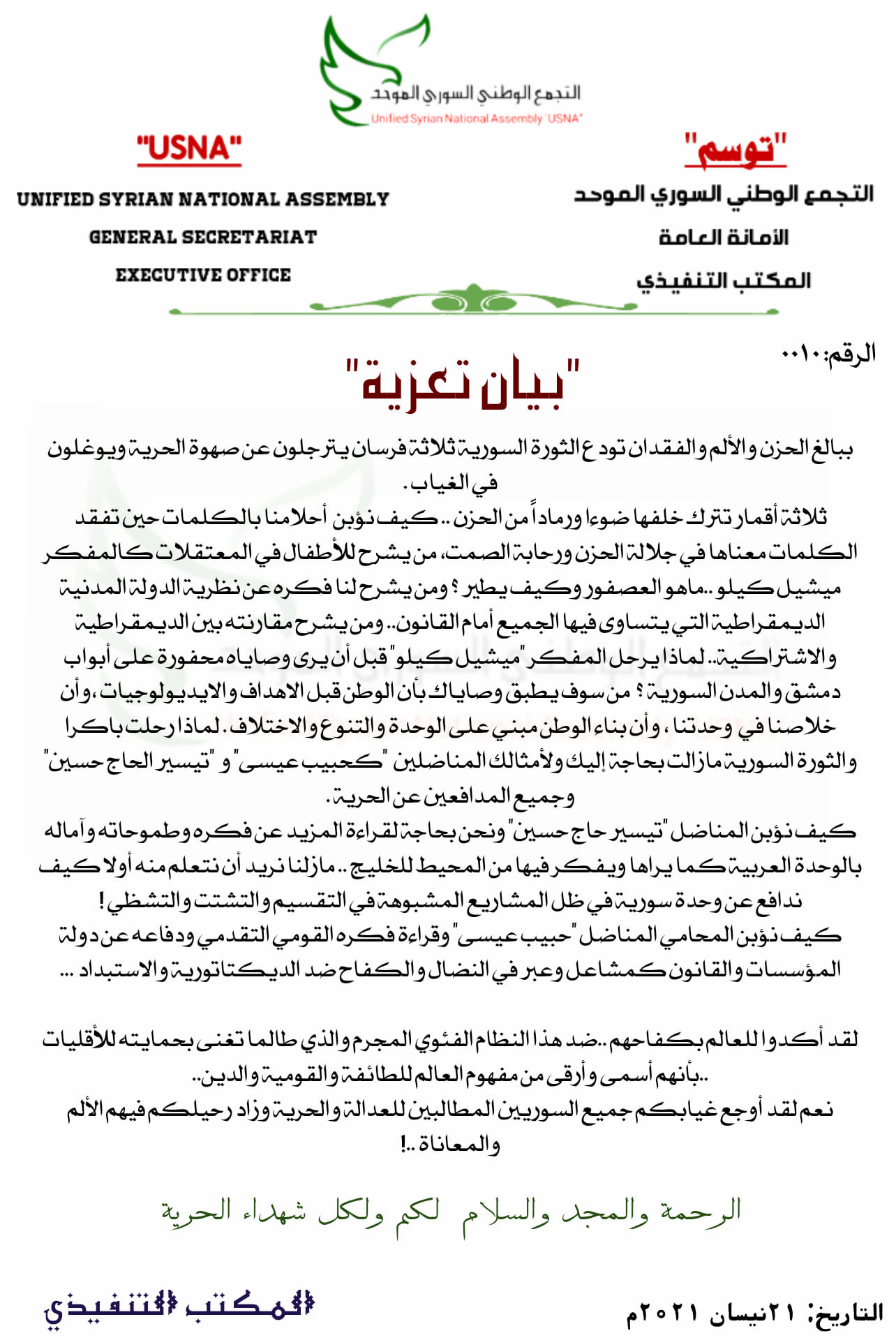 بيان تعزية من التجمع الوطني السوري الموحد برحيل ثلاثة أقمار عن ثورتنا السورية المباركة