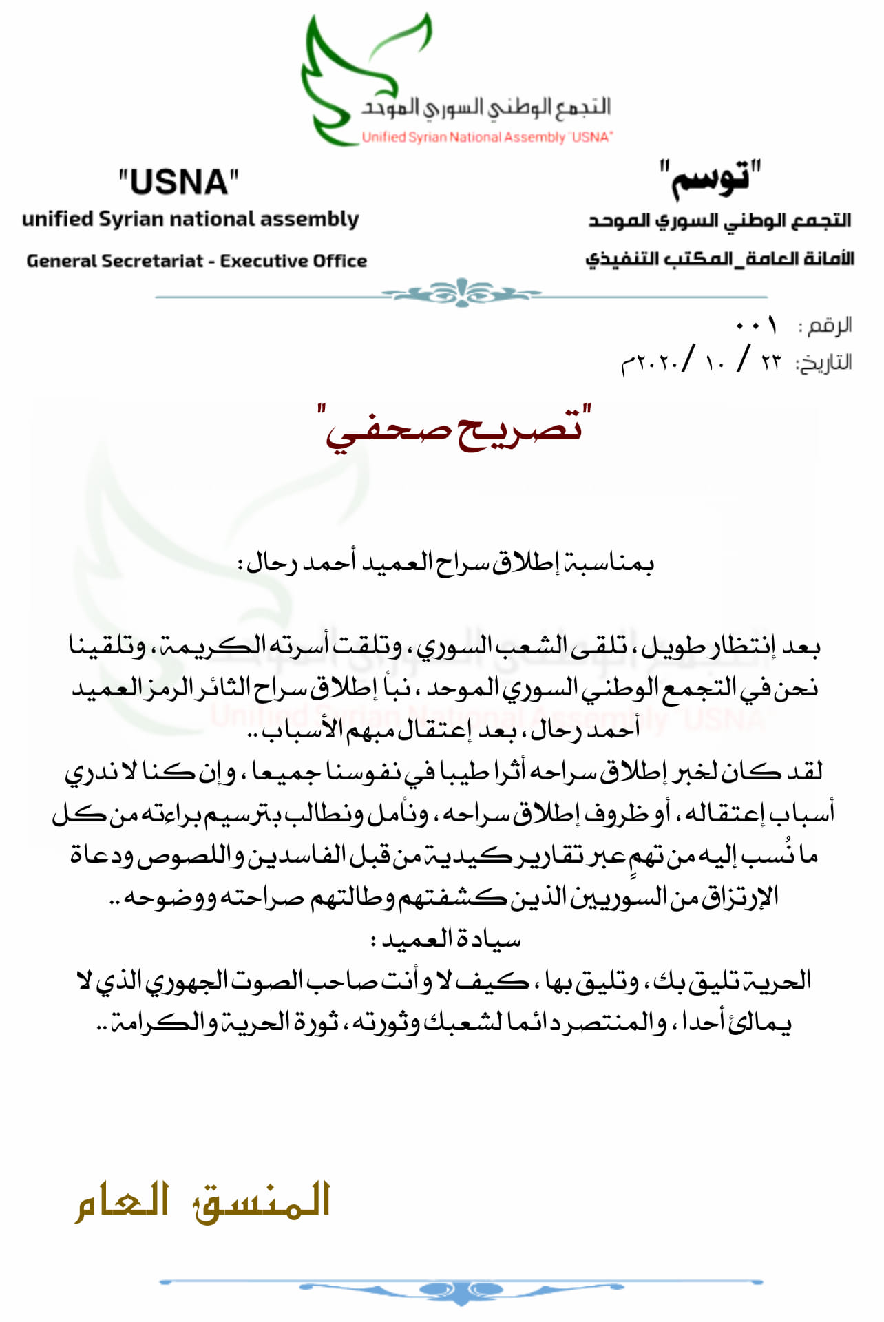 تصريح صحفي بمناسبة إطلاق سراح العميد أحمد رحال