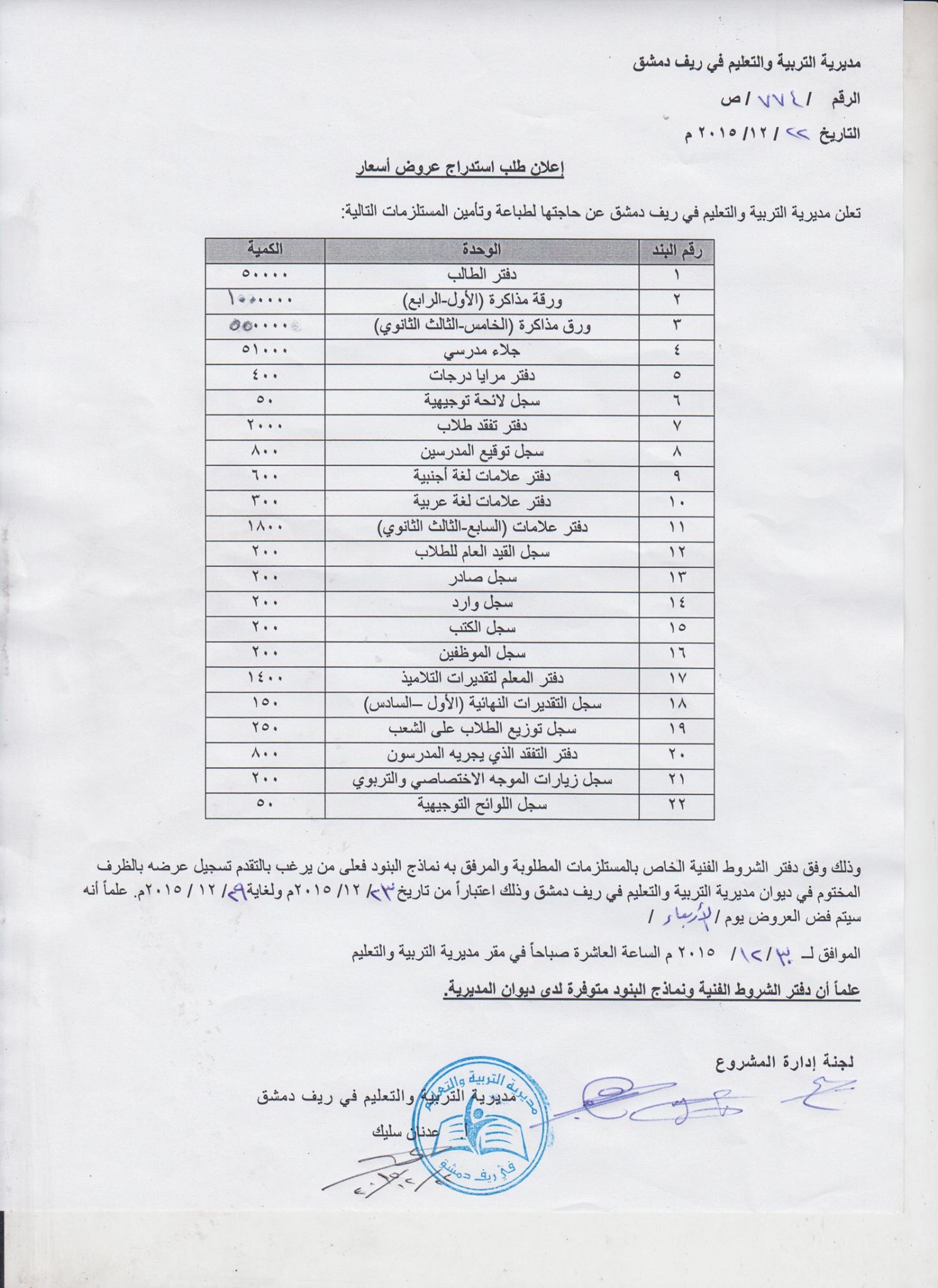 إعلان من مديرية التربية والتعليم في ريف دمشق حول حاجتها لعروض أسعار لشراء عدد من المواد المذكورة في الإعلان