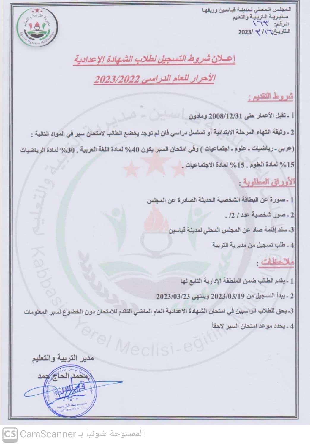 إعلان من مديرية التربية والتعليم بشأن شروط تسجيل طلاب الشهادة الإعدادية الأحرار للعام الدراسي 2022/2023