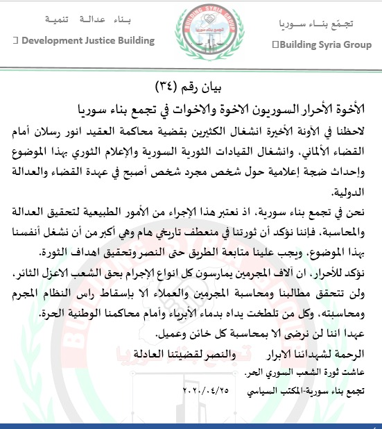 بيان تجمع بناء سوريا دعمًا لمحاسبة العقيد أنور رسلان وتأييد مجريات محاكمته