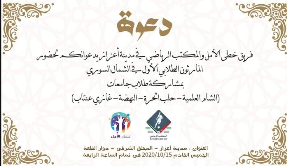 دعوة من المكتب الرياضي في مدينة أعزاز لحضور سباق الماراثون الطلابي الأول على أرض مدينة اعزاز