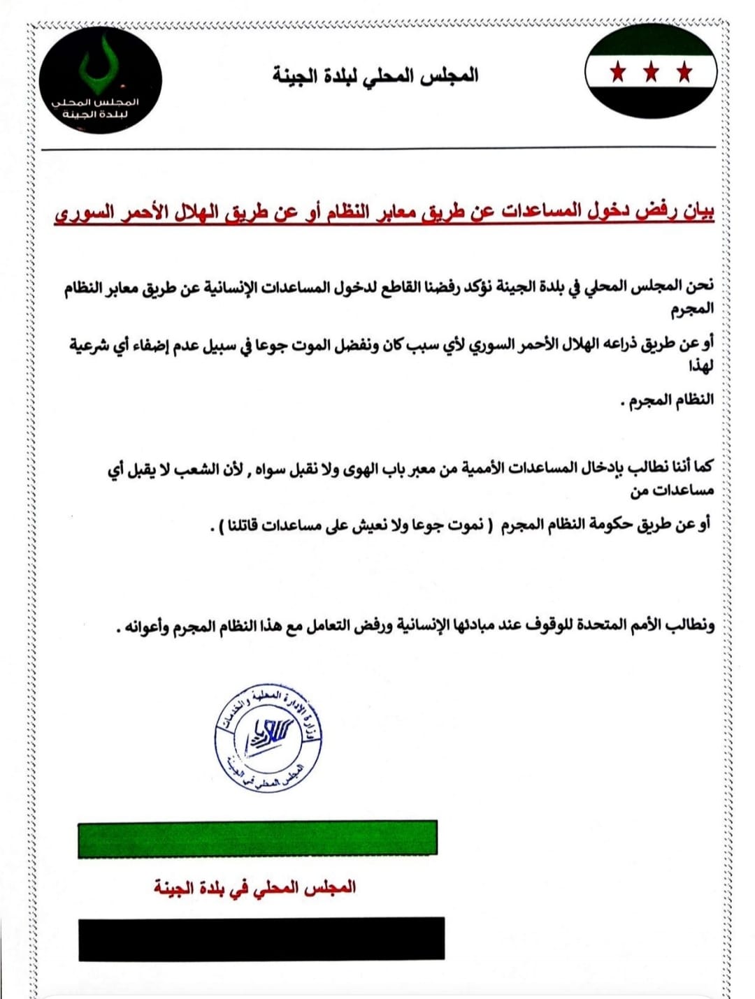 بيان من المجلس المحلي لبلدة الجينه يرفض فيه دخول المساعدات عن طريق معابر النظام أو الهلال الأحمر السوري