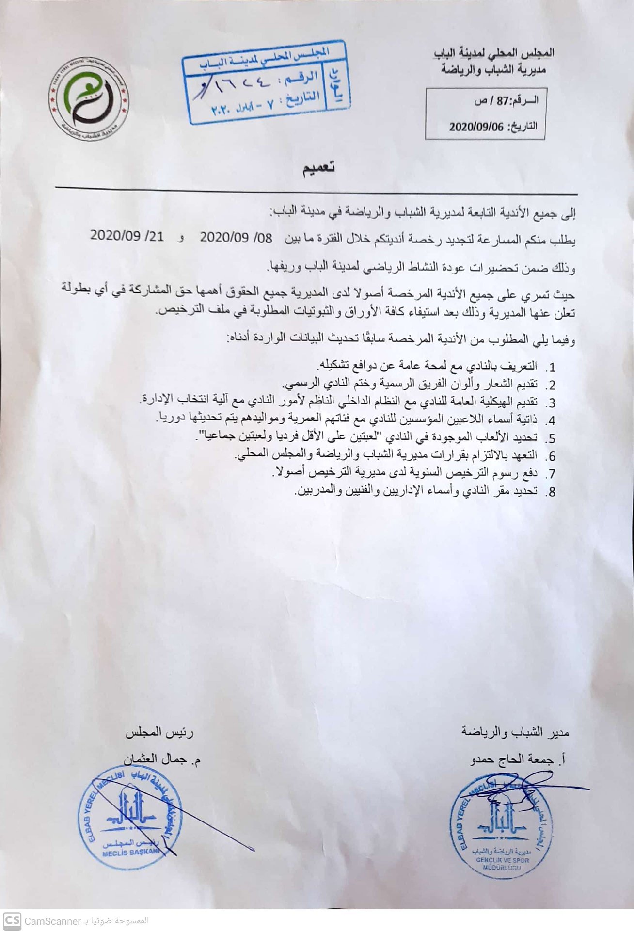 تعميم من مديرية الشباب والرياضة في مدينة الباب لجميع الأندية التابعة للمديرية تجديد الرخص