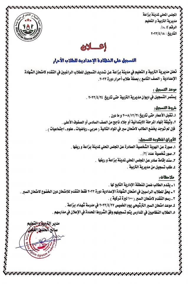 إعلان من مديرية التربية و التعليم في مدينة بزاعة بتمديد التسجيل للراغبين بتقديم امتحان الشهادة الإعدادية بصفة الأحرار