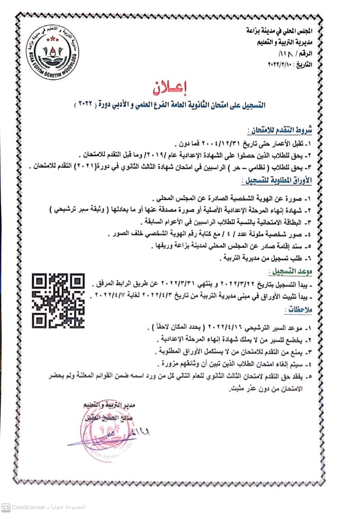 إعلان من مديرية التربية و التعليم في مدينة بزاعة بشأن بدء التسجيل على امتحان الثانوية العامة بفرعيها العلمي و الأدبي