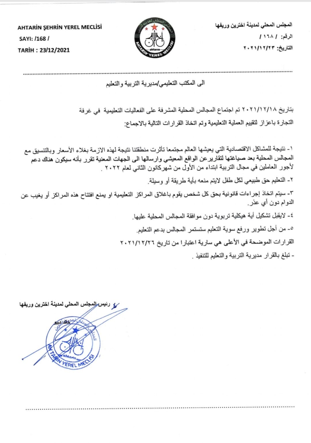 قرار المجلس المحلي في اخترين بدعم أجور العاملين في المجال التعليمي ابتدأً من الأول من شهر كانون الثاني 2022