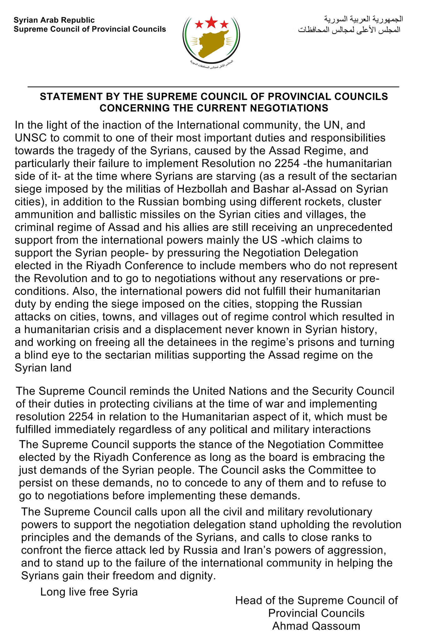 The Supreme Council calls upon all the civil and military revolutionary powers to support the negotiation delegation stand upholding the revolution principles and the demands of the Syrians, and calls to close ranks to confront the fierce attack led by Russia and Iran’s powers of aggression, and to stand up to the failure of the international community in helping the Syrians gain their freedom and dignity.