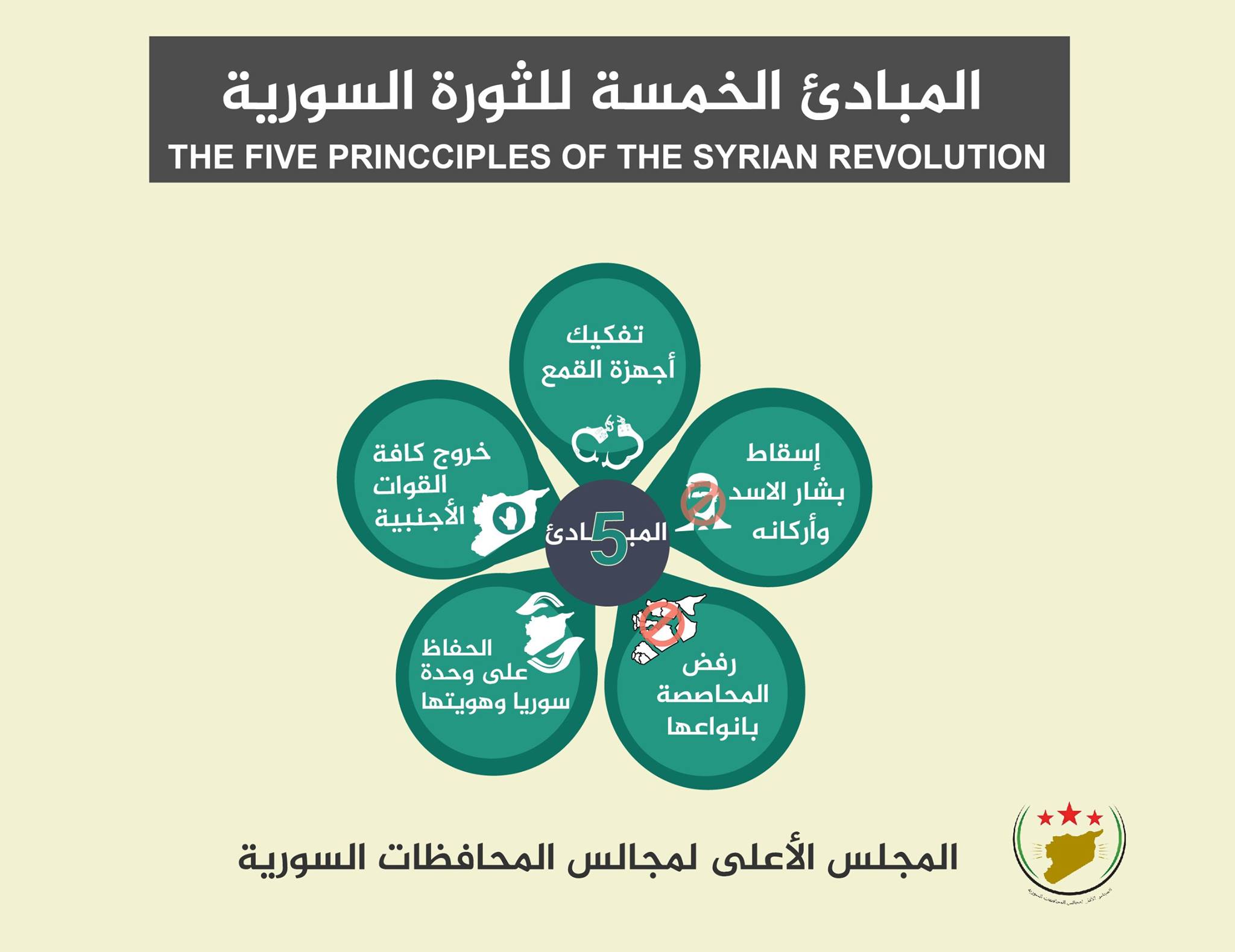 إنَّ المجلس الأعلى لمجالس المحافظات السورية يتبنى المبادىء الخمسة للثورة السورية :