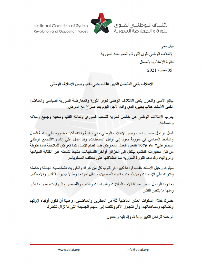 الائتلاف ينعى المناضل الكبير عقاب يحيى نائب رئيس الائتلاف الوطني لقوى الثورة والمعارضة السورية
