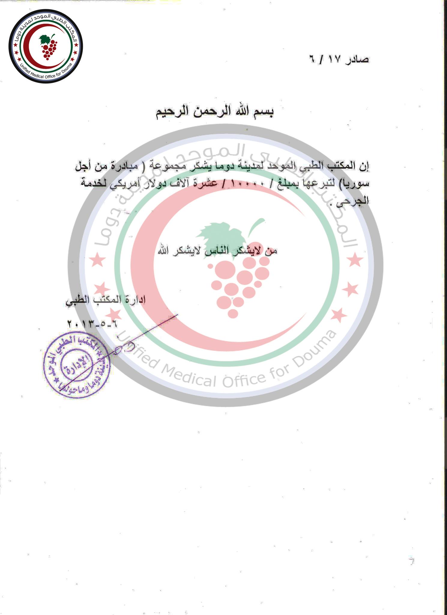 بيان شكر من المكتب الطبي لمدينة دوما لمجموعة مبادرة من أجل سوريا جديدة على تقديمها مبلغ 10 ألاف دولار لخدمة الجرحى