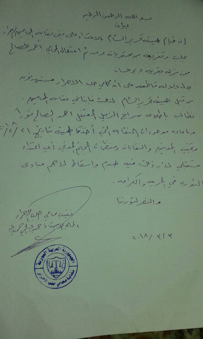 نقابة محامي حلب تدين اعتقال المحامي أحمد الصالح من قبل هيئة تحرير الشام