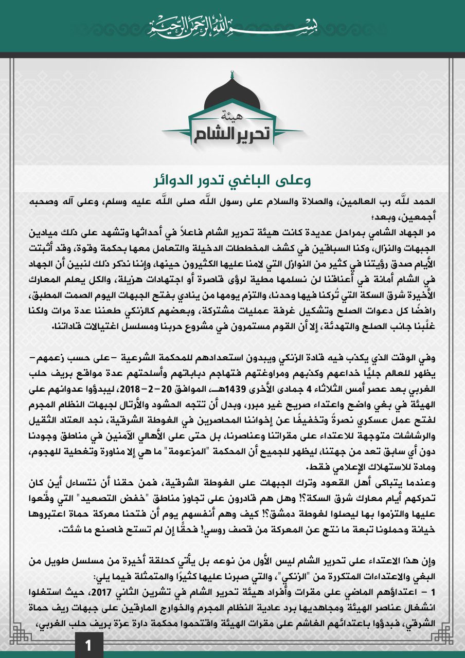 إن المشاكل المعقدة والمتشابكة لا تعالج بطرق ترقيعية شكلية وجلسات صلح عابرة يخرج منها المعتدي بفرصة أفضل ليجدد بغيه وإجرامه ويتهرب من تبعات ما اقترفت يداه، ولذا فإننا في تحرير الشام نحمّل قادة "الزنكي" المسؤولية الكاملة عن كل ما سبق من جرائم واعتداءات، وندعوهم لتسليم أنفسهم للخضوع لمحكمة شرعية، كما ندعو جنود "الزنكي" للابتعاد عن تلك القيادة المجرمة التي تسعى لتوريطهم والزج بهم في صراع لا ناقة لهم فيه ولا جمل، وندعوهم لالتزام جبهات القتال ونقاط الرباط على النظام المجرم والنأي بأنفسهم عن أي قتال داخلي لا يصب إلا في مصلحة أعداء الأمة.